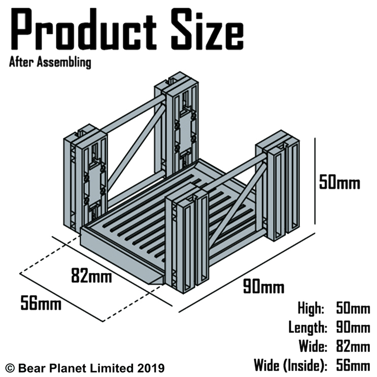 Approximately 90mm in length, 82mm in width [56mm in width (inside)], and 50mm in height when assembled.
